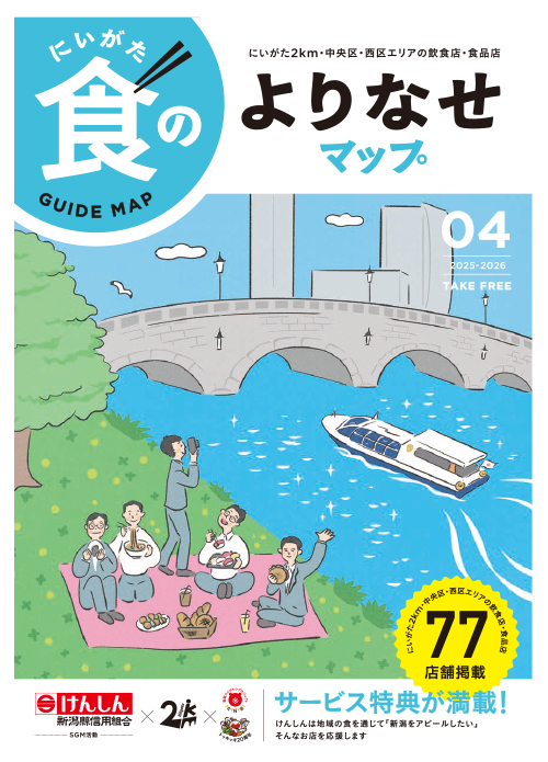 地元飲食店の店舗情報や特典サービスを紹介する「食のガイドマップ」を作成し、新潟市「にいがた2km」とのタイアップにより、エリアの食のPRを行います。