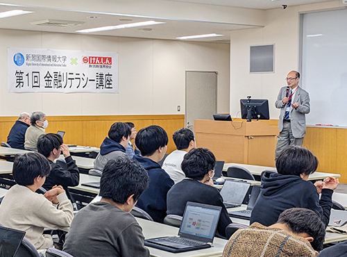 同校の経営情報学部1年生約200名がメイン会場と各ゼミ会場に分かれ、Webでの配信も行いながら実施されました。 学生の皆さんも真剣な眼差しで講義に集中してくださり、とても有意義な寄附講座となりました。 今後も金融業務に関する様々な分野から講座を提供し、少しでも学生の皆さんのお役に立てればと考えています。